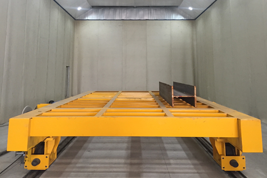 A component carried with the help of Gantry and placed on trolley and then it will enter to Shot blasting area.