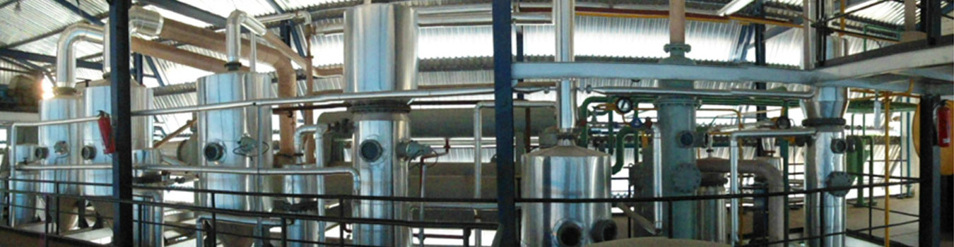 Mixture of oil and solvent obtained in the extractor is known as Miscella and it normally contains 15% to 25% of oil in solvent. The rich miscella from extractor is collected in tanks from where it is pumped to the distillation column. It is kept under vacuum by means of a series of steam ejector. The miscella passing through tubes of evaporator is heated by jacketed steam and thus hexane is turned into vapour immediately. The vapours are led to the condensers via separators. The concentrated miscella passes on to the Oil Preheater to raise the temperature to 100ÂșC and then to stripping column for final removal of the last traces of solvent from oil. The vapours from the equipments are condensed in the condenser.