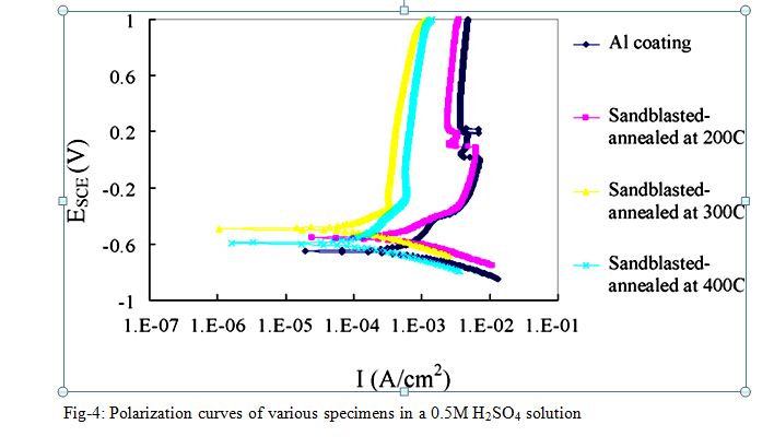 Among all the specimens the nano crystalline aluminum coating surface experienced annealing at 300 0C for 60 min exhibits the highest corrosion potential and the lowest corrosion current density, followed by that annealed at 4000C. Annealing at 200 oC did not result in marked improvement, which could be attributed to possibly incomplete nano crystallization when annealed at the relatively lower temperature during which dislocation cells might not be fully turned into nano-sized grains, bearing in mind that dislocations make electrons more active and promote electrochemical reactions. Compared to the untreated Al coating, the nano crystallized Al coatings experienced recovery treatment at 300 and 400 0C showed higher corrosion potential sand lower corrosion currents in the 0.5M H2SO4 solution. The higher corrosion potential of the nano crystallized Al coating reflect sits increased inertness to corrosion and the lower corrosion current is directly related to a lower corrosion rate of the coating in the solution. The improved corrosion resistance is attributed to the nano crystallized surface layer in which the high-density grain boundaries promote atomic migration and thus accelerate passivationor the formation of a protective Al oxide film to block further corrosion reaction.