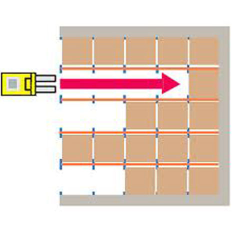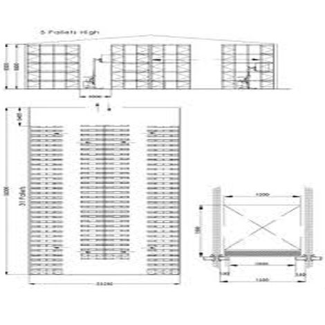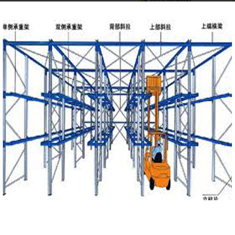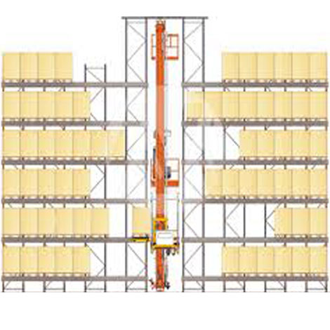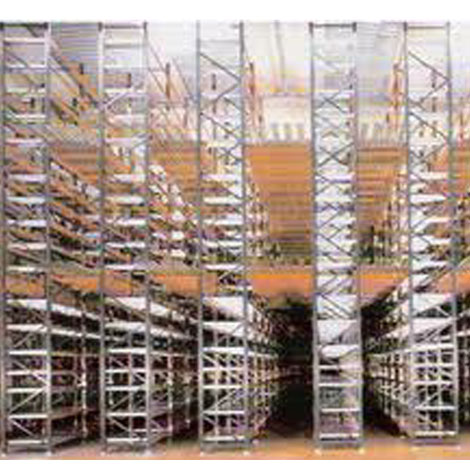 Drive In (Drive Through) Racking is used where high density storage is required. It is frequently used used in facilities with a low number of product lines. Pallets are stored in a block system with two blocks generally served by one operating aisle. The trucks drive into the racking to load or retrieve pallets which are stored on cantilevered rails running throughout the system. The first pallet in is the last pallet out unless a Drive Through system is used, whereby pallets can be loaded or retrieved from either side of the block.