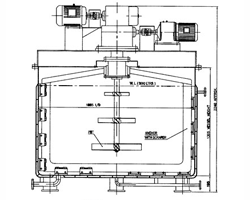 The mixing element are two in numbers, concentric to each other and contra rotating - a) An Anchor with scraper blades running close to the container wall operating at 20 R.P.M. driven by 3 H.P. Motor and b) A set or three pitched bladed turbine type impellers mounted on a central solid shaft operating at 144 R.P.M. driven by 7.5 H.P. Motor.