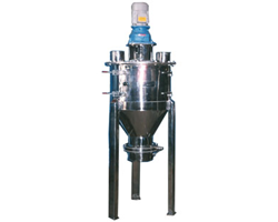 This equipment consists of a vertical cylindrical container with a conical bottom and a flat top cover. Inside the container and along its axis a finned star type rotor rotates. The fins are mounted radial to the central shaft of the rotor and can range from 4 to 6 numbers depending on the size of the equipment. The fin's edges towards the container are provided with flexible adjustable non metallic elements whereby the gap between the fins and the container body can be maintained to the minimum.