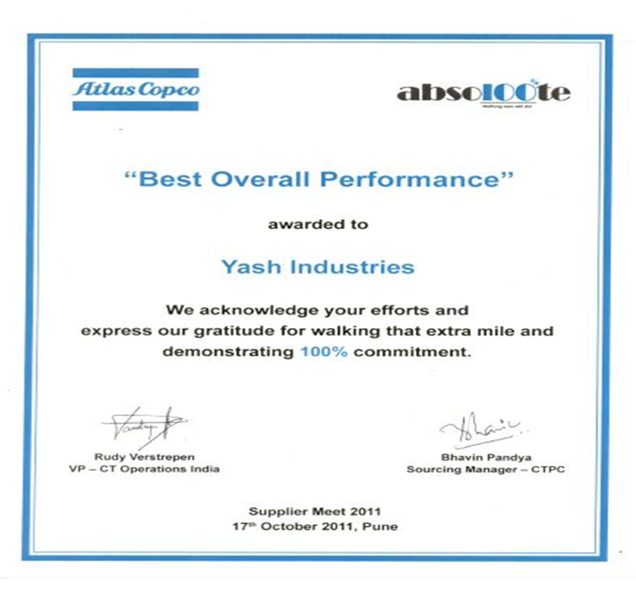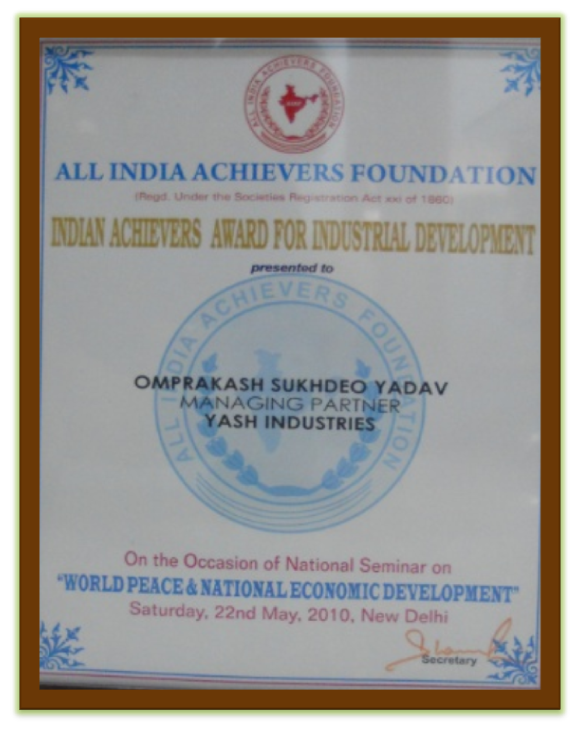 We the complete Team of YASH LASERTEK INDIA PVT.LTD. are proud to get the National Award for the Year 2010 from a National agency "All Indian Achievers Foundation Award."