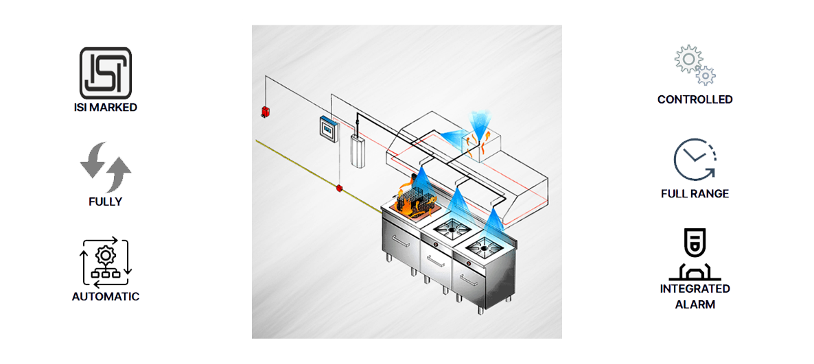 Kitchen fires are some of the fiercest and most difficult fire to fight and diminish. Fire hazard risk is very dangerous in commercial kitchen. Kitchen fire is generally due to burning of oil. In any kitchen there are inflammables like LPG on the premises, this aggravates the danger considerably. Kitchen; be it of asmall café or a large industrial kitchen SAFEPRO kitchen fire suppression system is equipped & ready to protect. Our fire extinguishers are wet chemical based and are specially designed to fight cooking oil fire arising in the kitchen with no flooding related collateral damage. The SAFEPRO Fire kitchen suppression system is designed for fire protection in hoods & ducts of cooking appliances & commercial kitchen and restaurants.