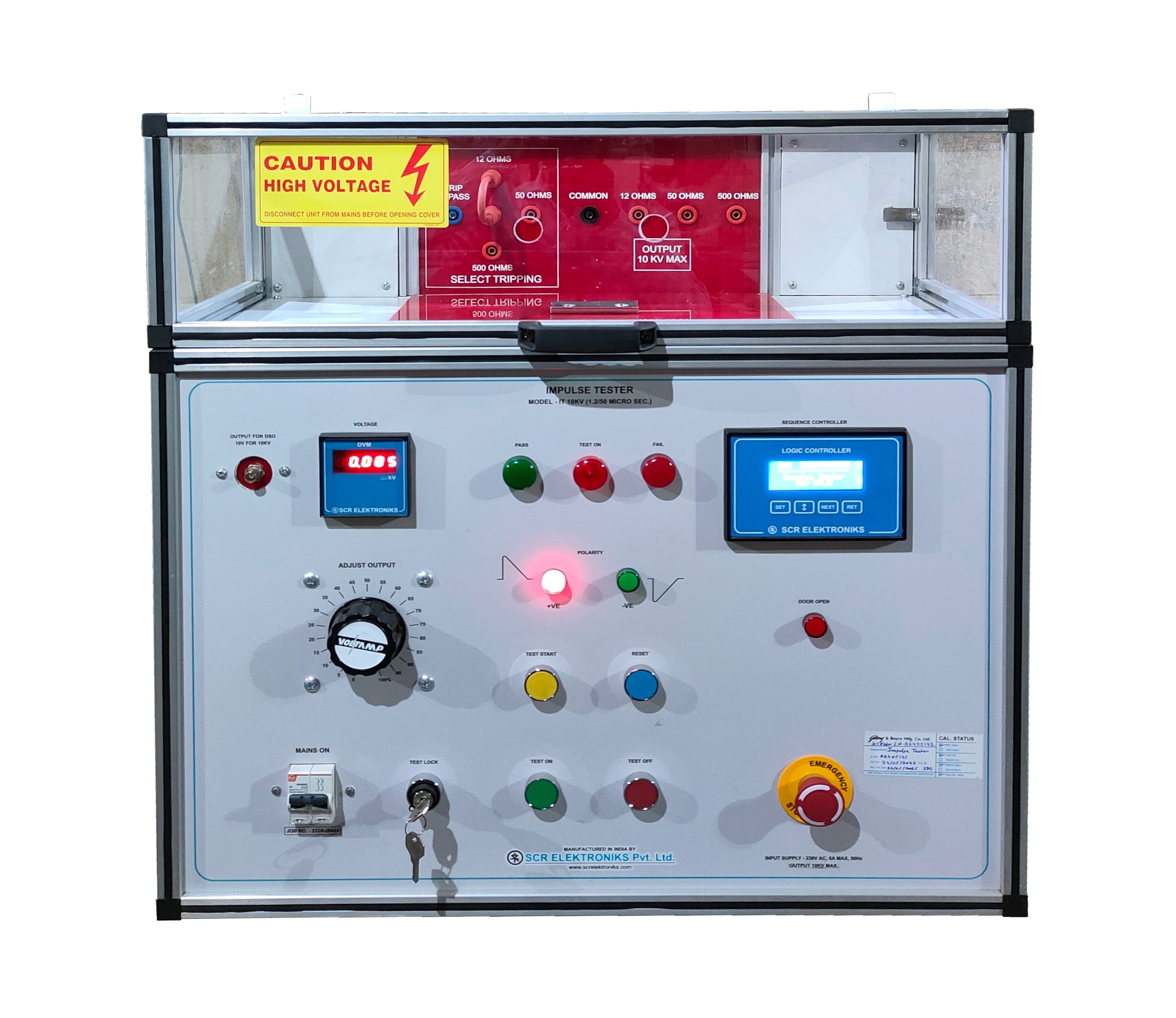 The peak voltage can be adjusted by the user. The test sequence i.e. number of Impulse for Positive and Negative polarity, time between two subsequent impulses & so on can be programmed with the help of a dedicated PLC module. The entire sequence, for both positive and negative impulse is automatic. At the end of the test, the test results are displayed on HMI. Output is provided for connecting an oscilloscope for displaying the Wave Form at the output Terminals. In case any flash over occurs, it is detected by a circuit which stops the test sequence, and PLC displays the number of cycles with polarities at which the failure has taken place.